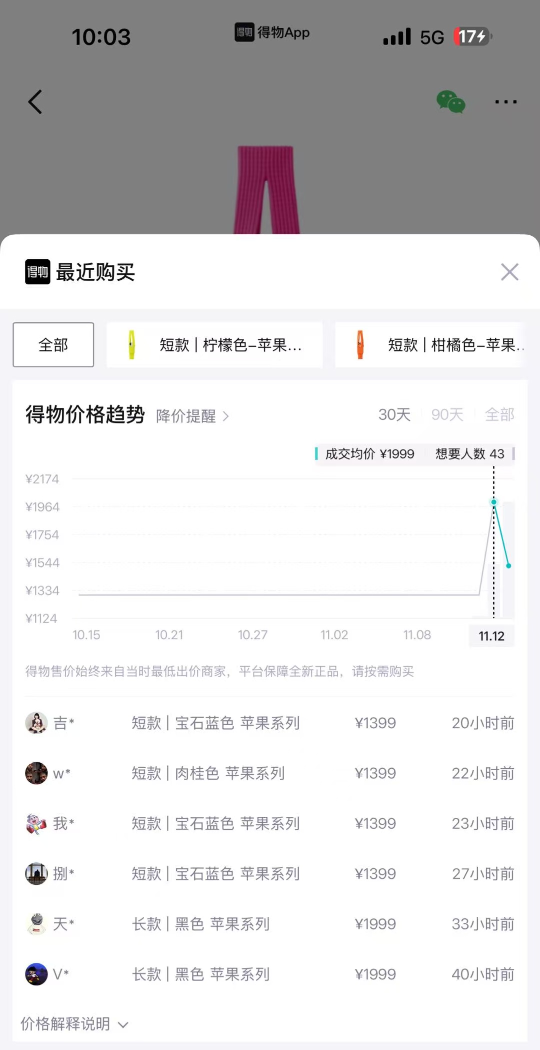 得物App数据显示,iPhone Pocket长款市场价上涨到2399元,短款价格上涨到1699元,最高溢价500元。而另一边,该产品的平替款也在社交平台出现,30-60元就能买到一个,甚至还有“姥姥织的”同款,标价50元。
