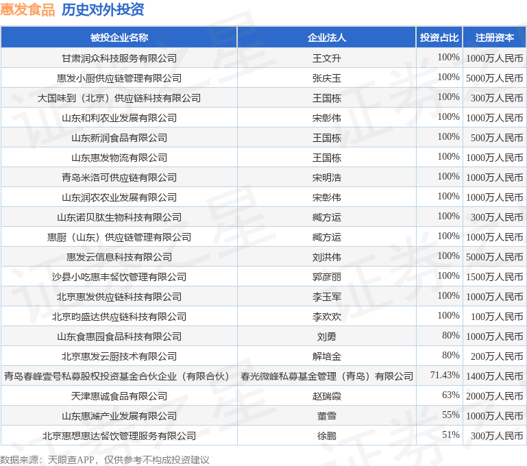 本站消息,根据天眼查APP显示,惠发食品(603536.SH)新增一起对外投资事件,被投资公司为甘肃润众科技服务有限公司,法定代表人王文升,投资占比为100%。该公司从事专业技术服务业,注册资本为1000万人民币。目前,惠发食品共存在对外投资26项,投资占比前20的项目见下表: