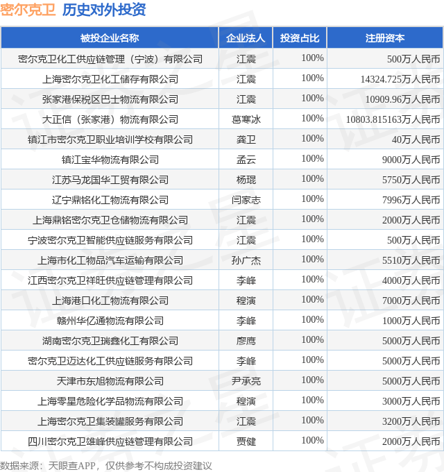 本站消息,根据天眼查APP显示,密尔克卫(603713.SH)新增一起对外投资事件,被投资公司为密尔克卫化工供应链管理(宁波)有限公司,法定代表人江震,投资占比为100%。该公司从事商务服务业,注册资本为500万人民币。目前配资咨询平台,密尔克卫共存在对外投资66项,投资占比前20的项目见下表: