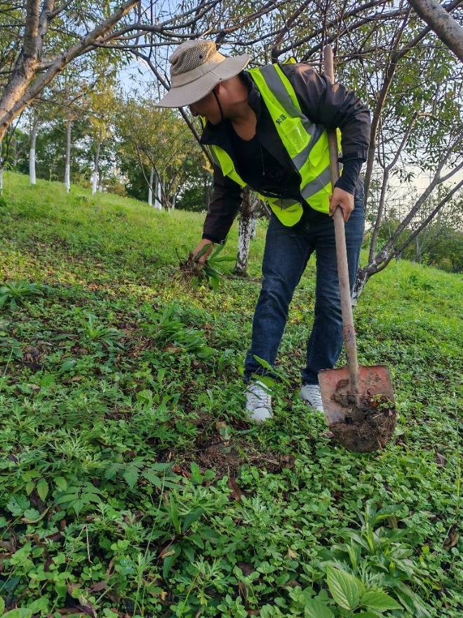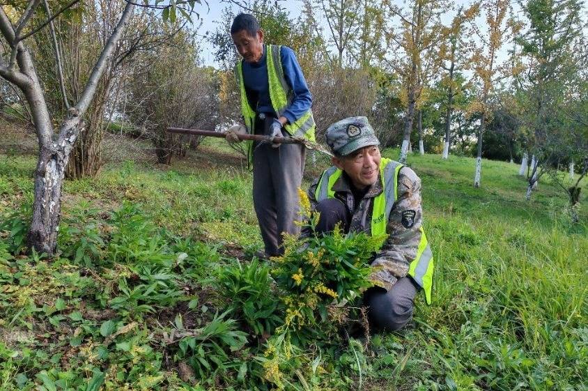 11月11日下午,在合肥市宿松路高架桥下东侧,合肥经开区海恒临湖社区绿化养护项目负责人程雅云正带着工人进行清理。现场,工人苏礼跃手持铁锹,熟练地将一簇“加拿大一枝黄花”连根挖出。经过多年实践,他已能迅速从草丛中辨识出这种植物。