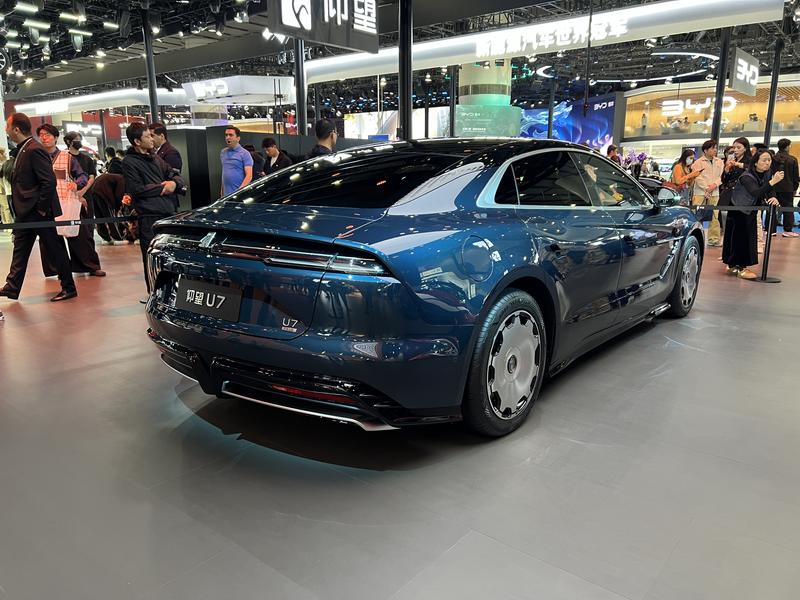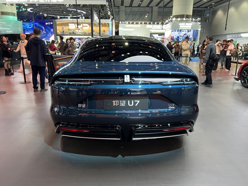 从侧面来看,车顶、前后轮的线条和设计灵感“能量晶石”一脉相承,塑造了优雅的新比例和新姿态。整车A柱靠前,从而提高了座舱和车长的比例,相比传统的行政轿车,仰望U7呈现出不一样的行政轿车新形态和新比例。