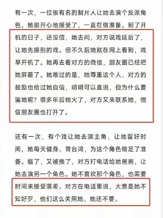 当时她都已经进组签了合同了,没想到副导演通知她,角色换成了投资方的女儿。