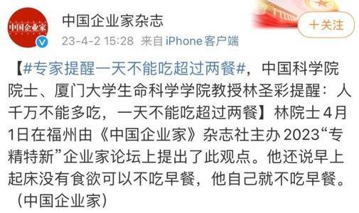 相信很多在坚持“减餐法”的中老年人都看过这段视频,中科院院士林圣彩在采访时说没必要一天超过2餐,人需要有一定的饥饿感。在饿的时候产生的生物反应,可促进长寿因子提升。