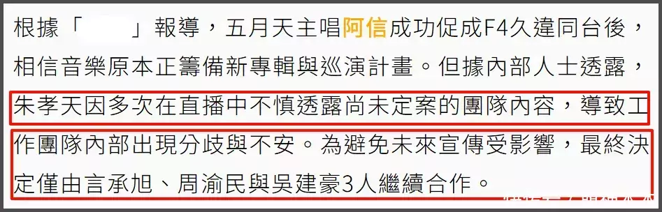 此前朱孝天在直播间直接曝光了后续F4会有单独的团体演唱会一事,还说已经在为了团体演唱会录新歌了,该说不该说的全都暴露,惹团队不满。