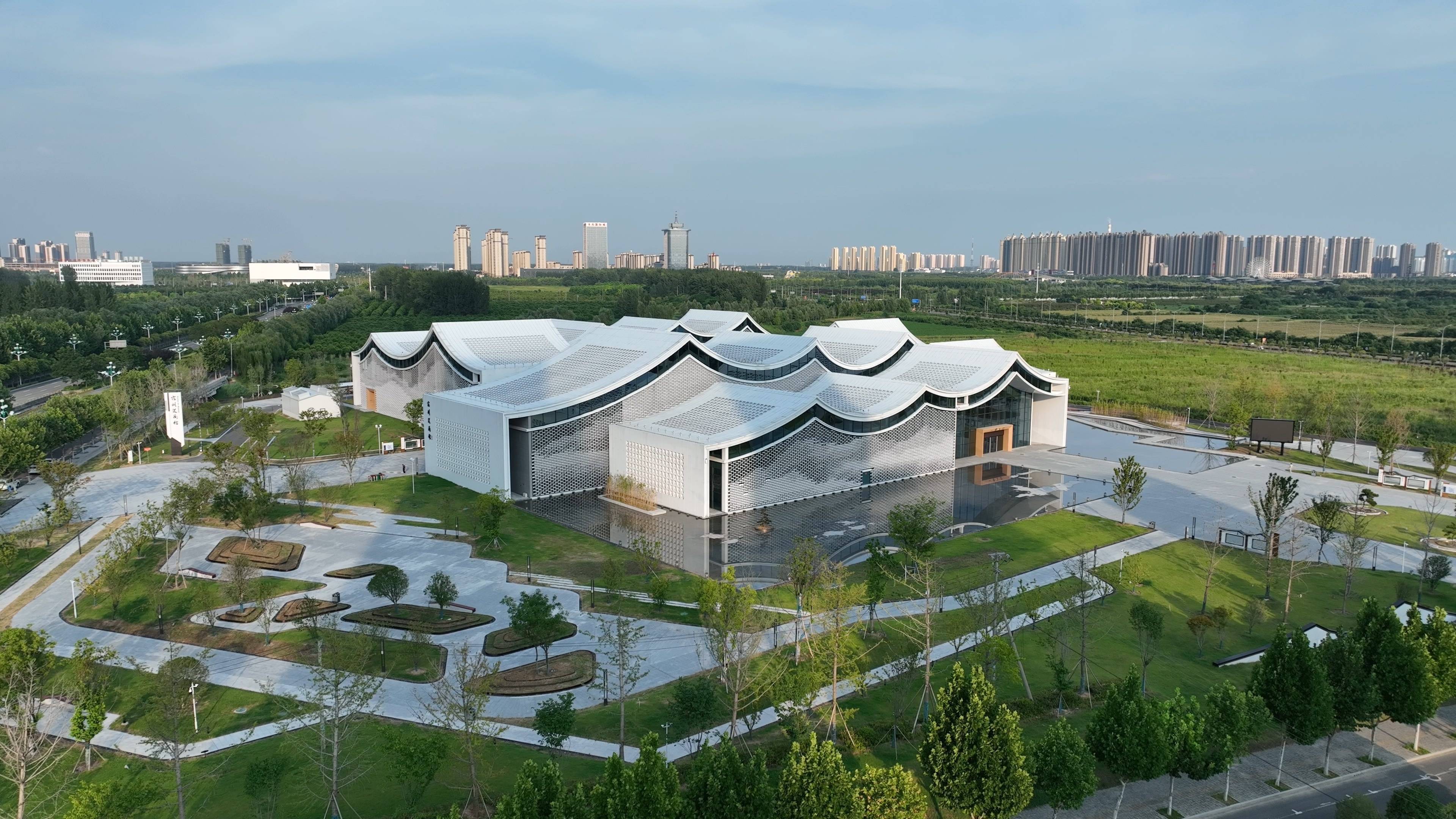 当日下午,采访团队来到宿州美术馆,该馆位于宿州市埇桥区,由中国美术学院设计,建筑以“天圆地方”哲学理念为核心,采用山水相融的设计理念,外立面采用玻璃幕墙与混凝土结构的虚实结合设计,形成独特光影韵律。