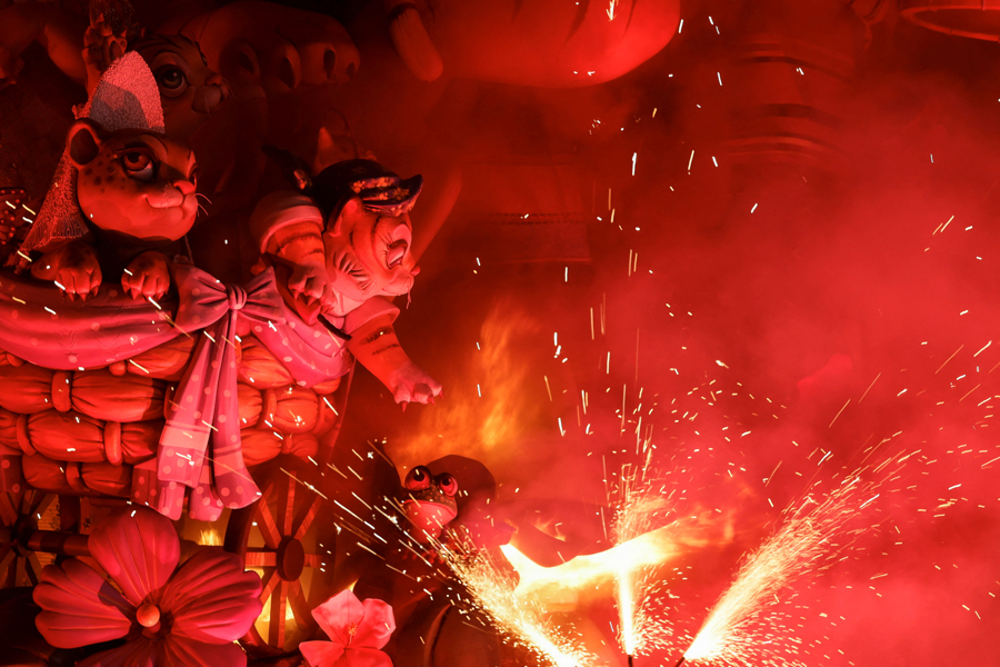这是3月19日在西班牙巴伦西亚拍摄的被点燃的法雅玩偶。法雅节是西班牙巴伦西亚的传统节日。节日期间,城市的大街小巷会摆满用木料、纸板和泡沫塑料做成的玩偶,这些玩偶被称作法雅。节日的最后一天夜晚,人们将所有玩偶焚烧,以迎接春天的到来。新华社图