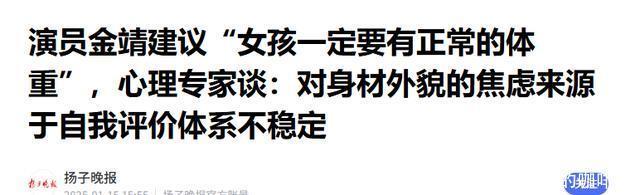 信息来源 扬子晚报2025-01-1515:55演员金靖建议“女孩一定要有正常的体重”,心理专家谈:对身材外貌的焦虑来源于自我评价体系不稳定
