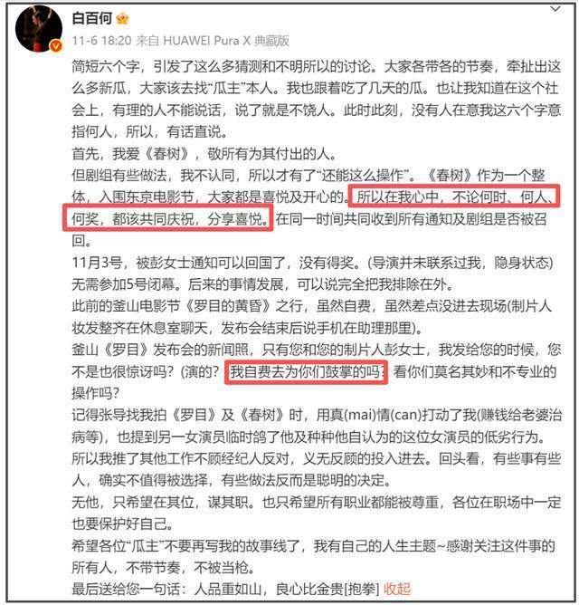 从片方的视角看,釜山电影节是影片得奖了,属于主创的集体荣耀,片方邀请女主角白百何她却没出席,到了东京电影节,她却愿意出席了,变来变去,还要指控片方孤立她,这怎么看都很错愕。包括白百何自己发文也很矛盾,她说希望共同庆祝分享喜悦,转头又说“我自费去给你们鼓掌吗”?所以她自己到底是愿不愿意分享喜悦鼓掌呢?