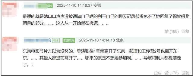 难怪网友质疑白百何在找补,认为本质是她没得奖,所以在发泄不满。实际上导演在内的所有人都不知道会不会得奖,所以很多人提前都离开了,只有她还在东京等消息,等到3日晚上才出通知,有些临时赶回来,有些取消航班,白百何等了几天没得奖,反而是挂件男主王传君得奖了,她可能也是受到冲击,于是用“过河拆桥 ”表达不满。