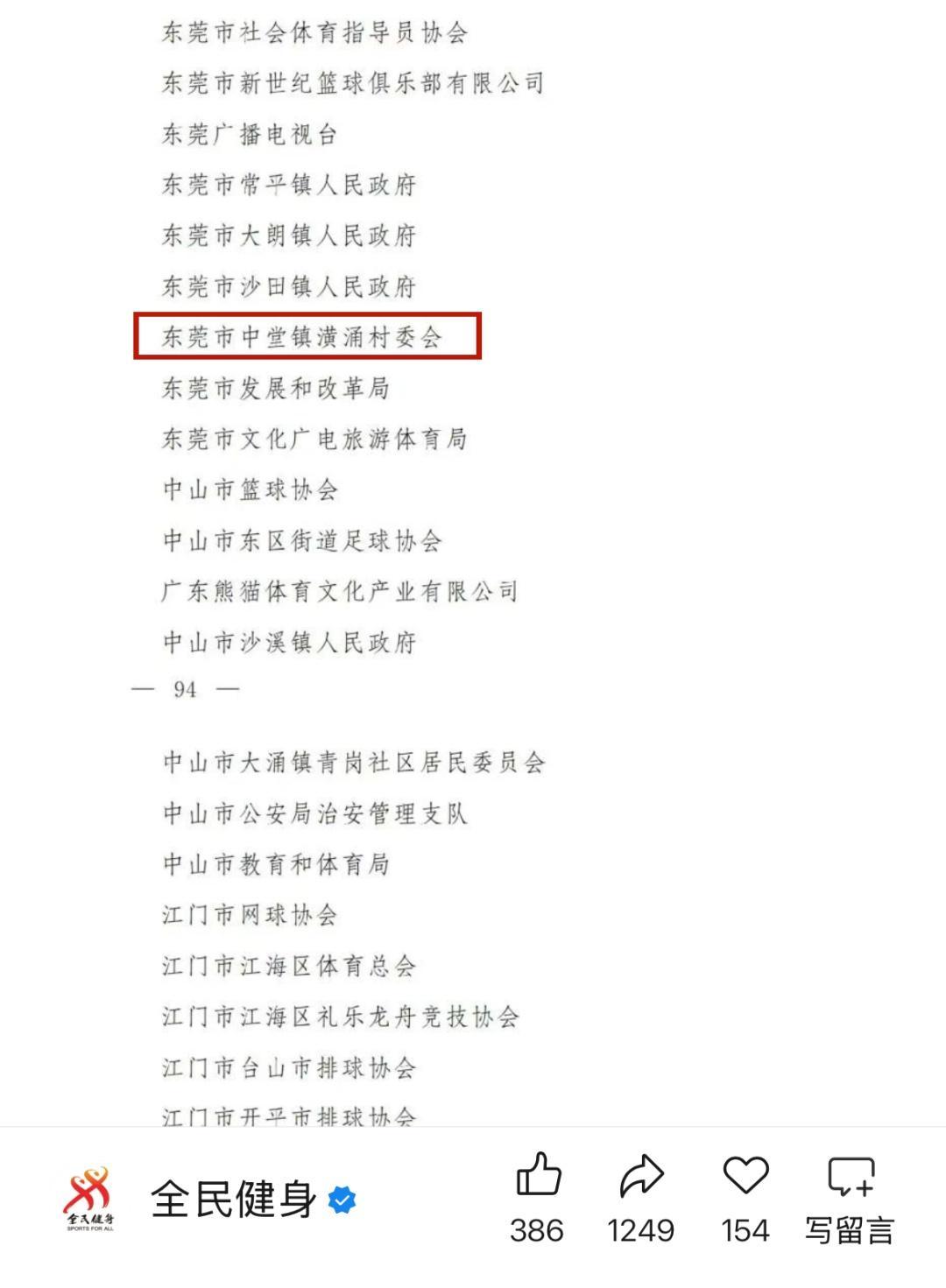 日前,国家体育总局对2021-2024年度全国群众体育先进单位和2021-2024年度全国群众体育先进个人进行表彰。其中,中堂镇潢涌村光荣上榜,获评“2021-2024年度全国群众体育先进单位”。